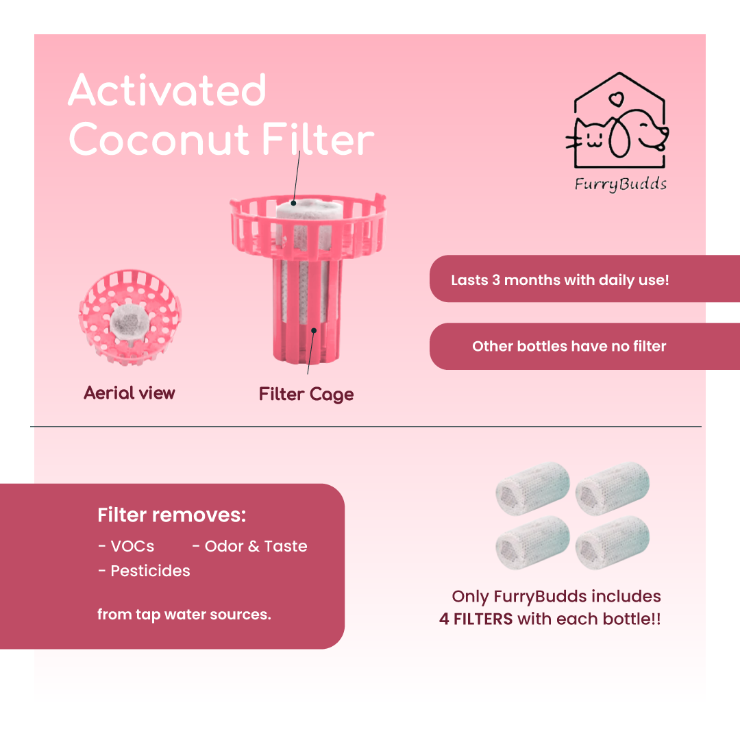 - 2-Stage Coconut Shell Filter + 1 Year Supply of cartridges! The outer wrap filters out larger particulates while the inner all-natural coconut based filter cleans out smaller matter. Each cartridge can last 3 months with daily use, four filter cartridges and one snap-on cage are included with your purcase! Filter suitable for hose, sink, tap water filtration, not for use with non-potable water or streams/saltwater/standing puddles, etc.