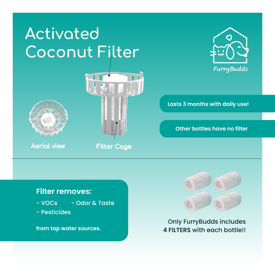 - 2-Stage Coconut Shell Filter + 1 Year Supply of cartridges! The outer wrap filters out larger particulates while the inner all-natural coconut based filter cleans out smaller matter. Each cartridge can last 3 months with daily use, four filter cartridges and one snap-on cage are included with your purcase! Filter suitable for hose, sink, tap water filtration, not for use with non-potable water or streams/saltwater/standing puddles, etc.